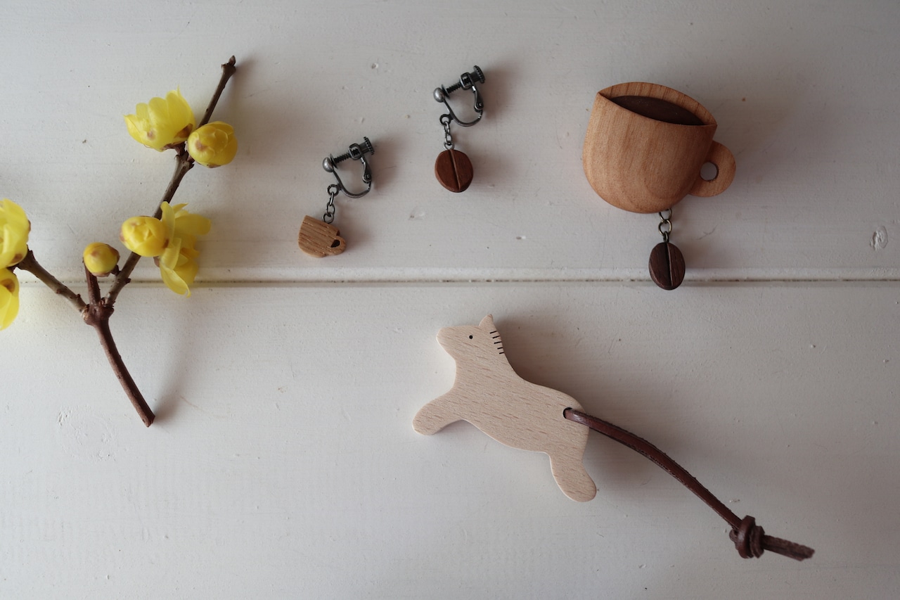 カップはハンノキ、コーヒーと豆はウォルナット、